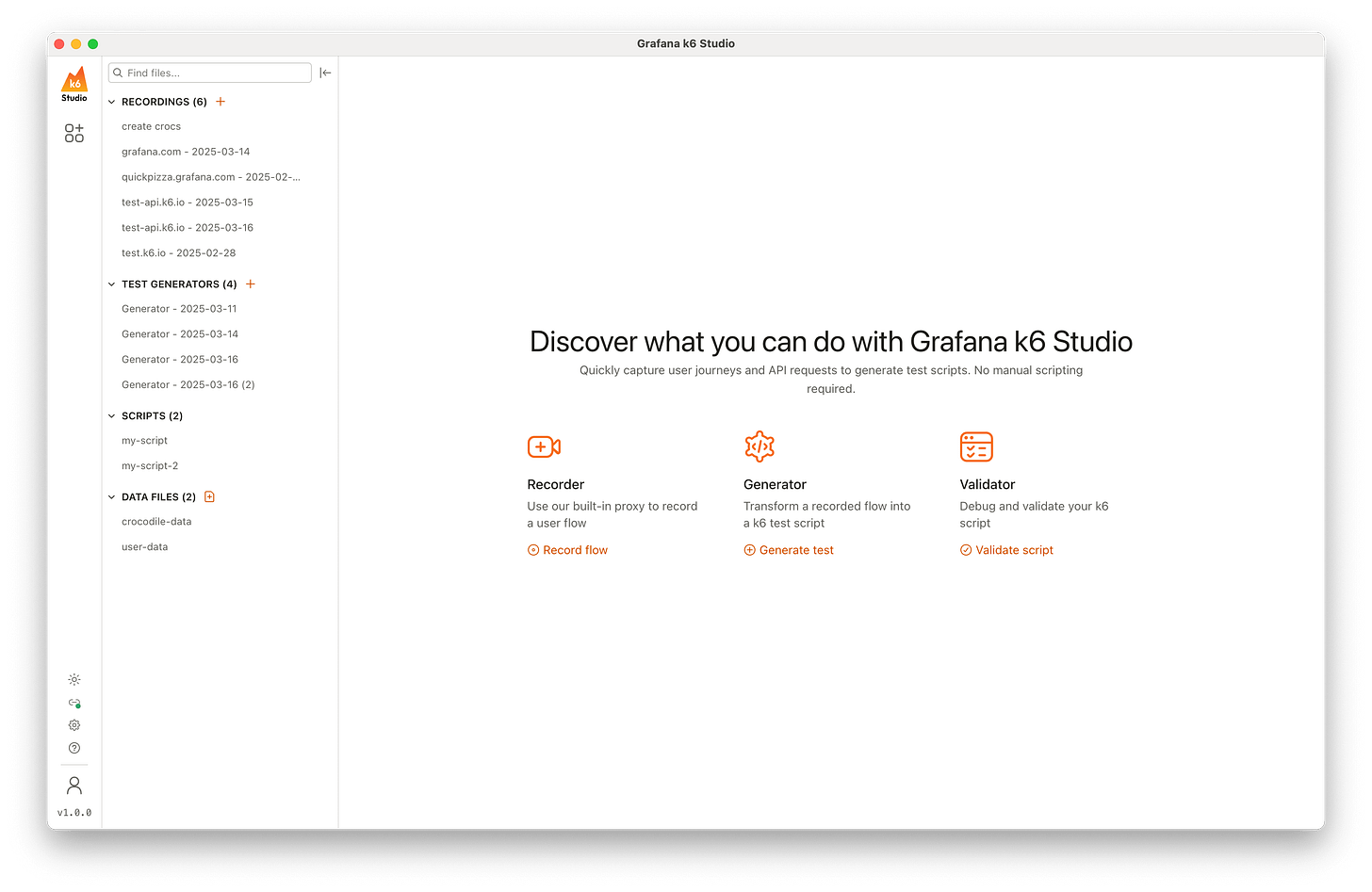 With features like the Recorder, Generator, and Validator, you can easily capture real user flows, customize scripts with precision, and debug them with confidence—all without leaving the desktop app.